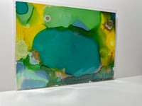 This unique mixed media artwork has been created with a combination of regular and metallic alcohol inks and white acrylic paint on medium Yupo. The stunning ocean-inspired theme is sure to catch your eye and provide a beautiful focal point for any room.